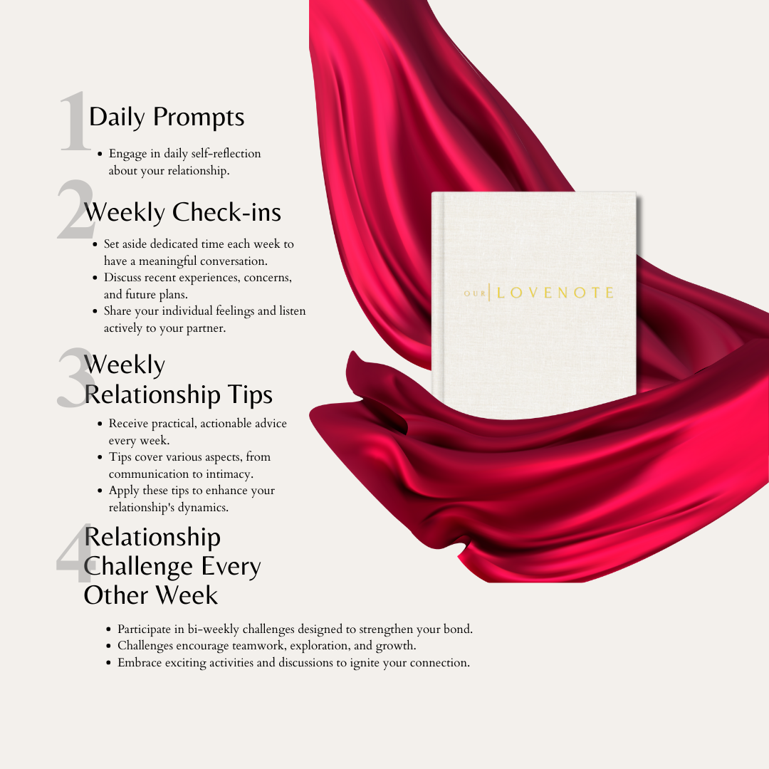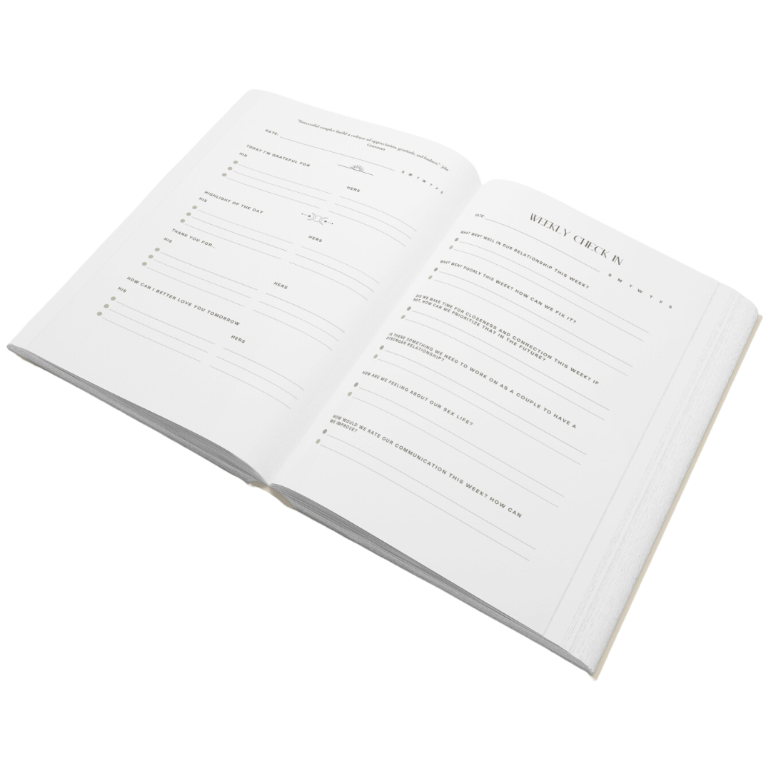 Our Love Note is a journal designed to strengthen your relationship through 6 months of daily prompts, weekly check-ins, practical advice, and fun couple challenges. It helps you express appreciation, discuss future goals, and build a deeper connection with your partner. But it doesn’t stop there. We know relationships take effort to grow. Just like a plant, they need to be watered consistently in order to flourish. That’s why, when you purchase an Our Love Note Journal, we also give you lifetime access to all of our guides—including the new ones we release every week. Because building a strong relationship isn’t a one-time effort; it’s an ongoing journey, and we want to give you the tools to keep growing together so you can have that healthy relationship you’ve been hoping for.